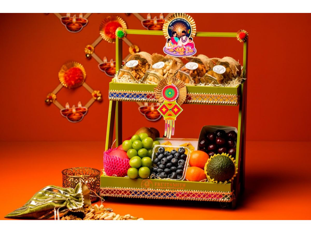Fuji apple, Imported green grapes, Blueberry, Green kiwi, Pomegranate, Avocado, Thai mandarin, Imported cherry, Cashew jar(135 gms approx), Walnut jar(110 gms approx), Almond jar(135 gms approx), Green raisin jar(110 gms approx) & Wax freshner tablet.