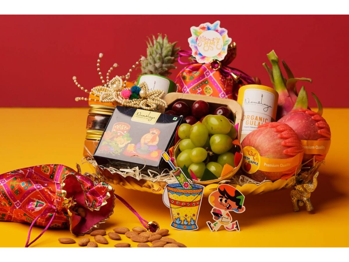 Thai pineapple, Pomegranate, Thai dragon, Fuji apple, Persimmon, Imported cherry, Green grapes muscat, Almond potli(300 gms approx), Organic gulal, Thandai(100 gms approx), Chandan & Mouth freshner.