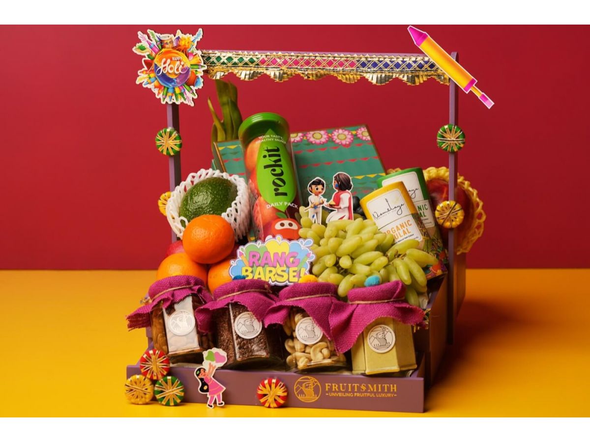 Rockit apple(5 pc tube), Blueberry, Avocado, Thai mandarin, Imported plum, Navel orange, Imported pear, Thai dragon, Seasonal mango, Indian Green grapes, Organic gulal, Gujiya 12 pc box, Almond jar(160 gms approx), Cashew jar(150 gms approx), Organic thandai jar(185 gms approx) & Flax seed jar(200 gms approx).