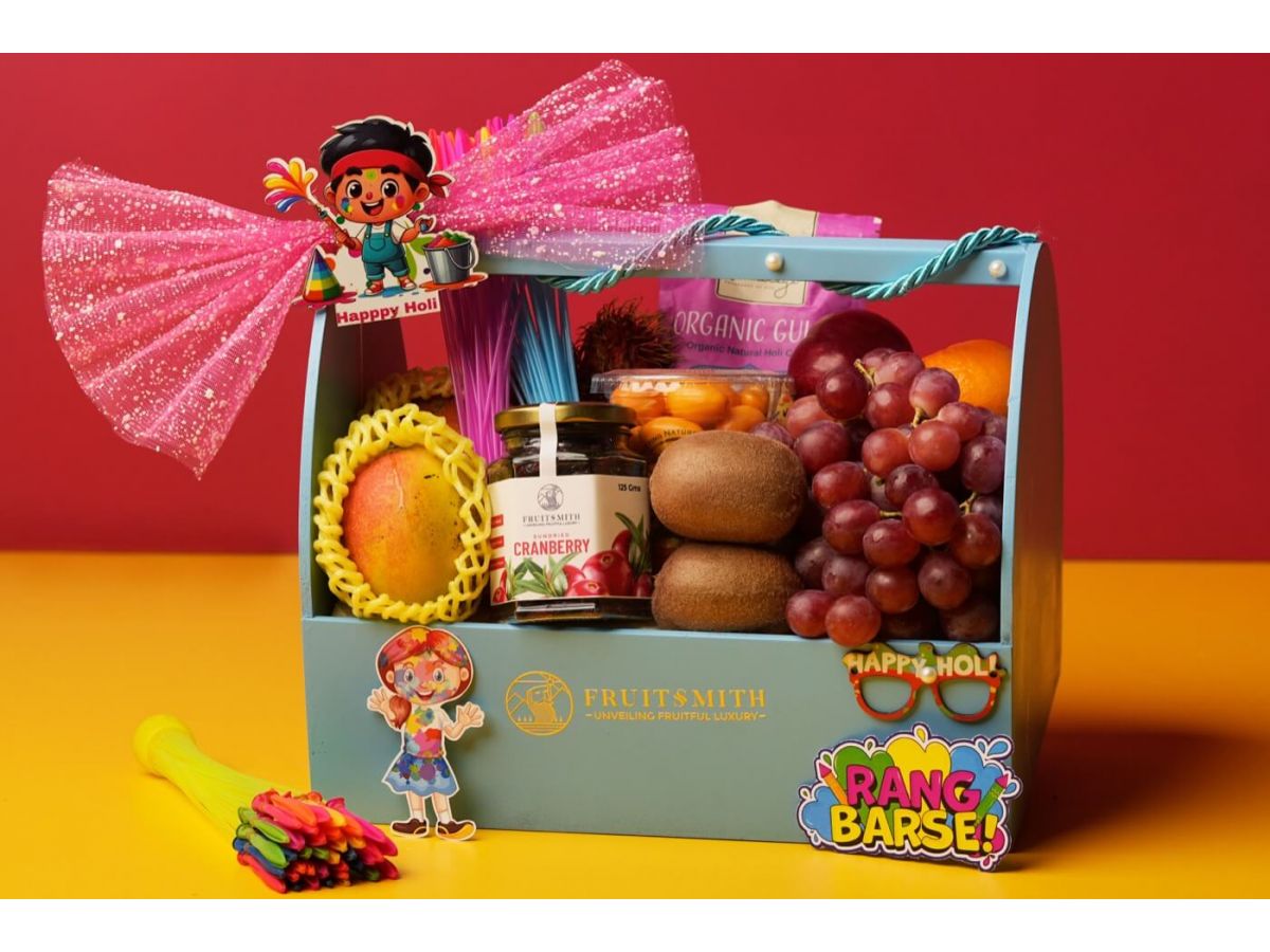 Green kiwi, Seasonal mango, Cape gooseberry, Red apple, Thai guava, Thai mandarin, Imported plum, Rambutan, Red globe grapes, Fruitsmith sundried cranberry jar, Organic gulal & Balloons.