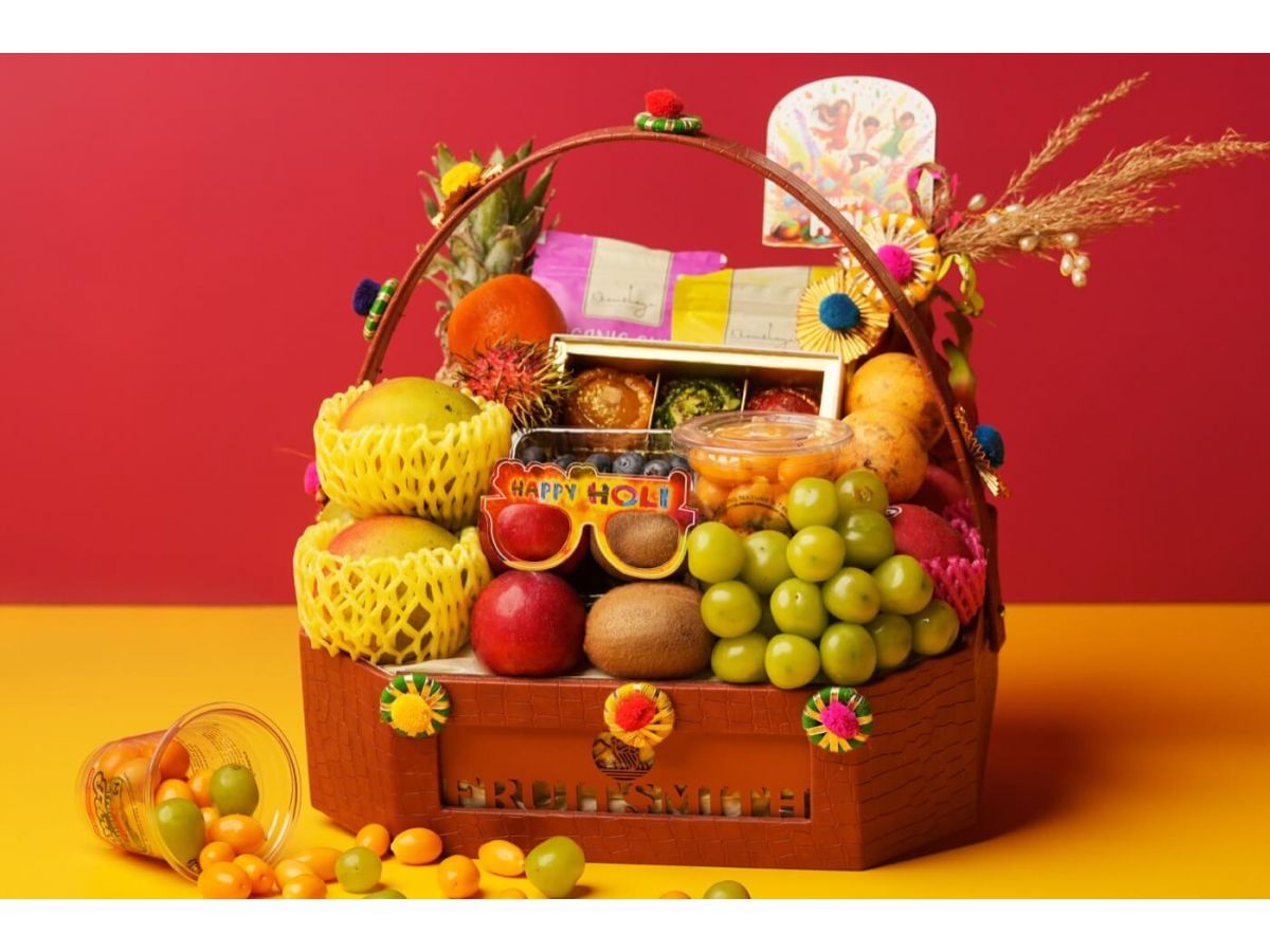 Fuji apple, Thai dragon, Thai pineapple, Navel orange, Imported plum, Green kiwi, Seasonal mango, South african pear, Rambutan, Thai mandarin, Blueberry, Cape gooseberry, Green grapes muscat, Passion fruit, Organic gulal & Gujiya 6 pc box.