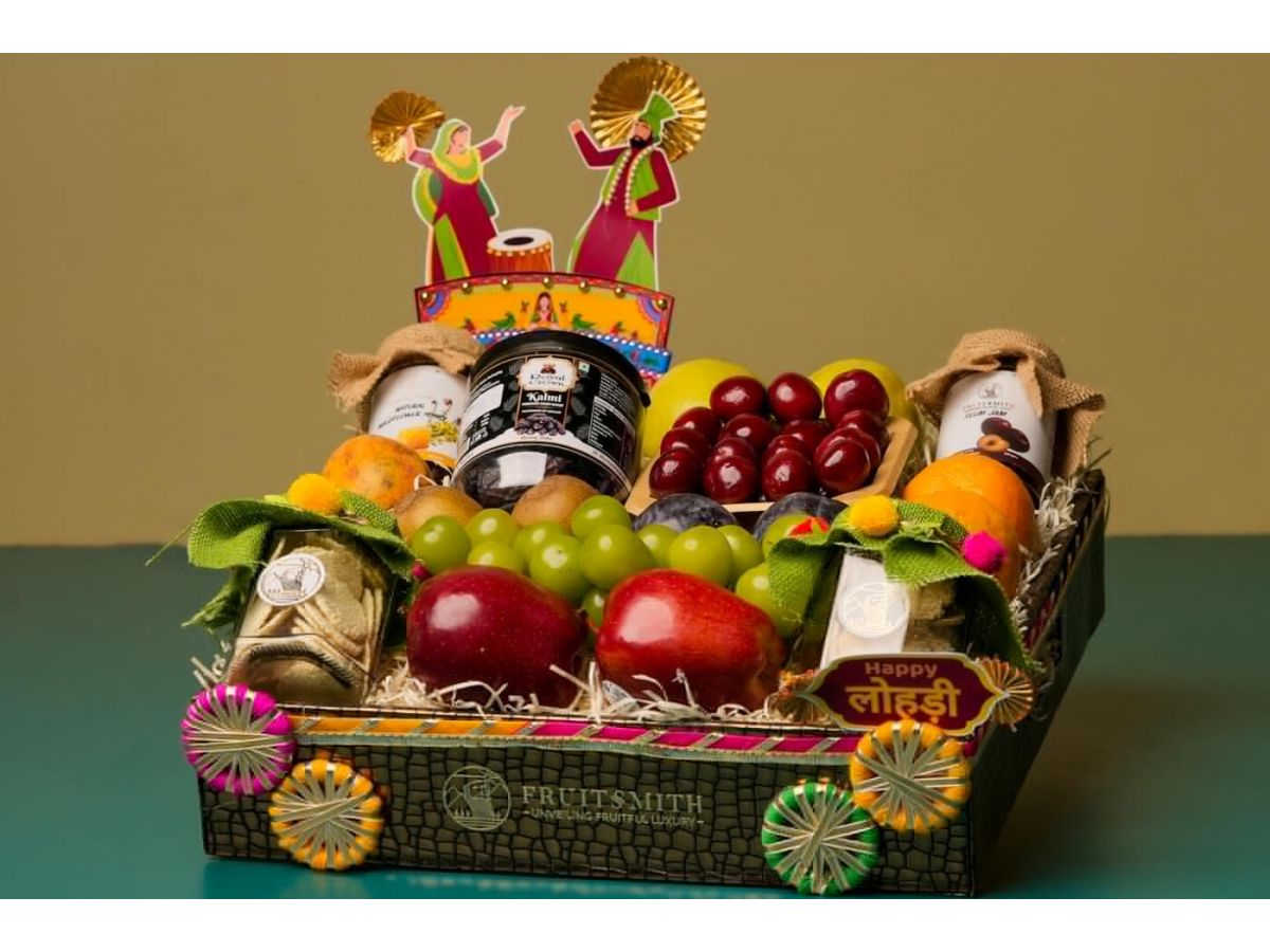 Imported pear, Passion fruit, Kalmi dates, Imported cherry, Thai mandarin, Green grapes muscat, Gold kiwi, Imported plum, Red apple, Fruitsmith apricot jam, Fruitsmith honey, Gud revadi(110 gms approx) & Cheeni revadi(120 gms approx).