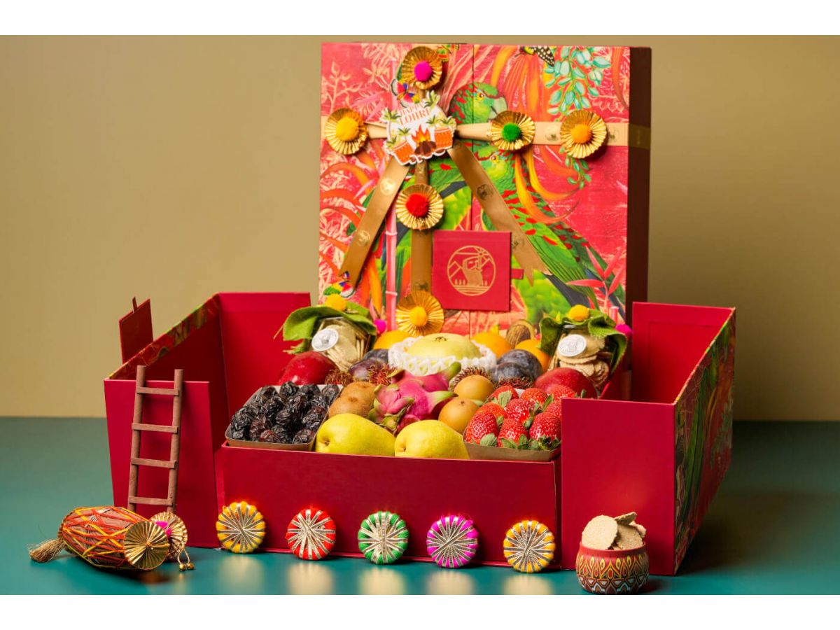 Strawberry, Imported pear, Gold kiwi, Green kiwi, Thai dragon, Rambutan, Imported plum, Thai mandarin, Red apple, Thai guava, Ajwa dates, Gud revadi(110 gms approx) & Cheeni revadi(120 gms approx).
